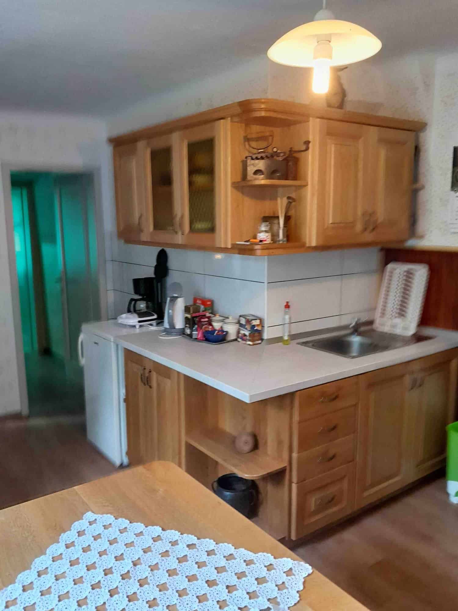 The kitchen is simple and somewhat dated but fully equipped with a fridge-freezer and all necessary cooking essentials.