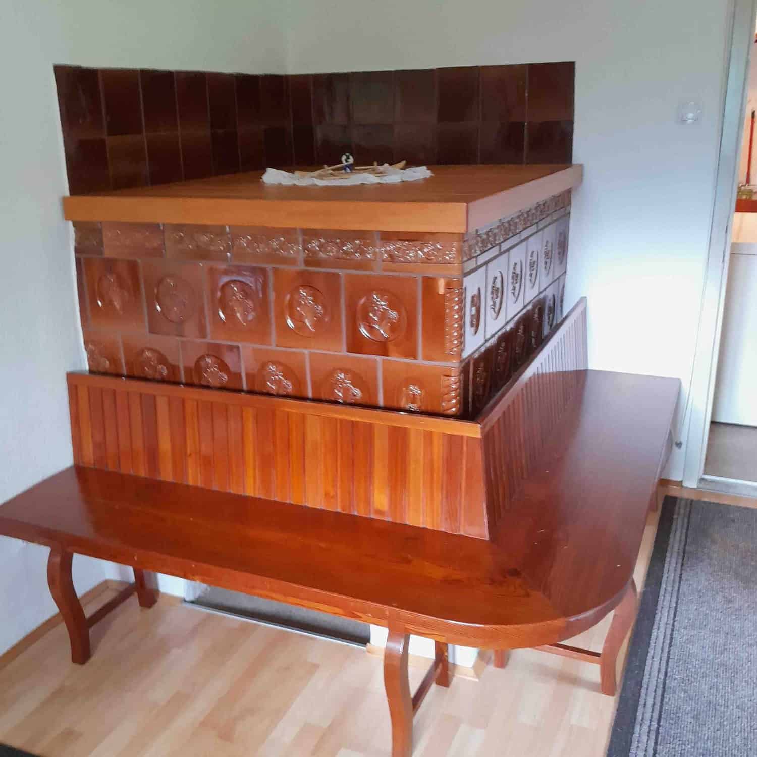 Inside, the living room offers a cozy atmosphere with a spacious sofa, a dining area, and air conditioning for added comfort. The interior reflects the style of the past, enhancing the home’s unique charm.